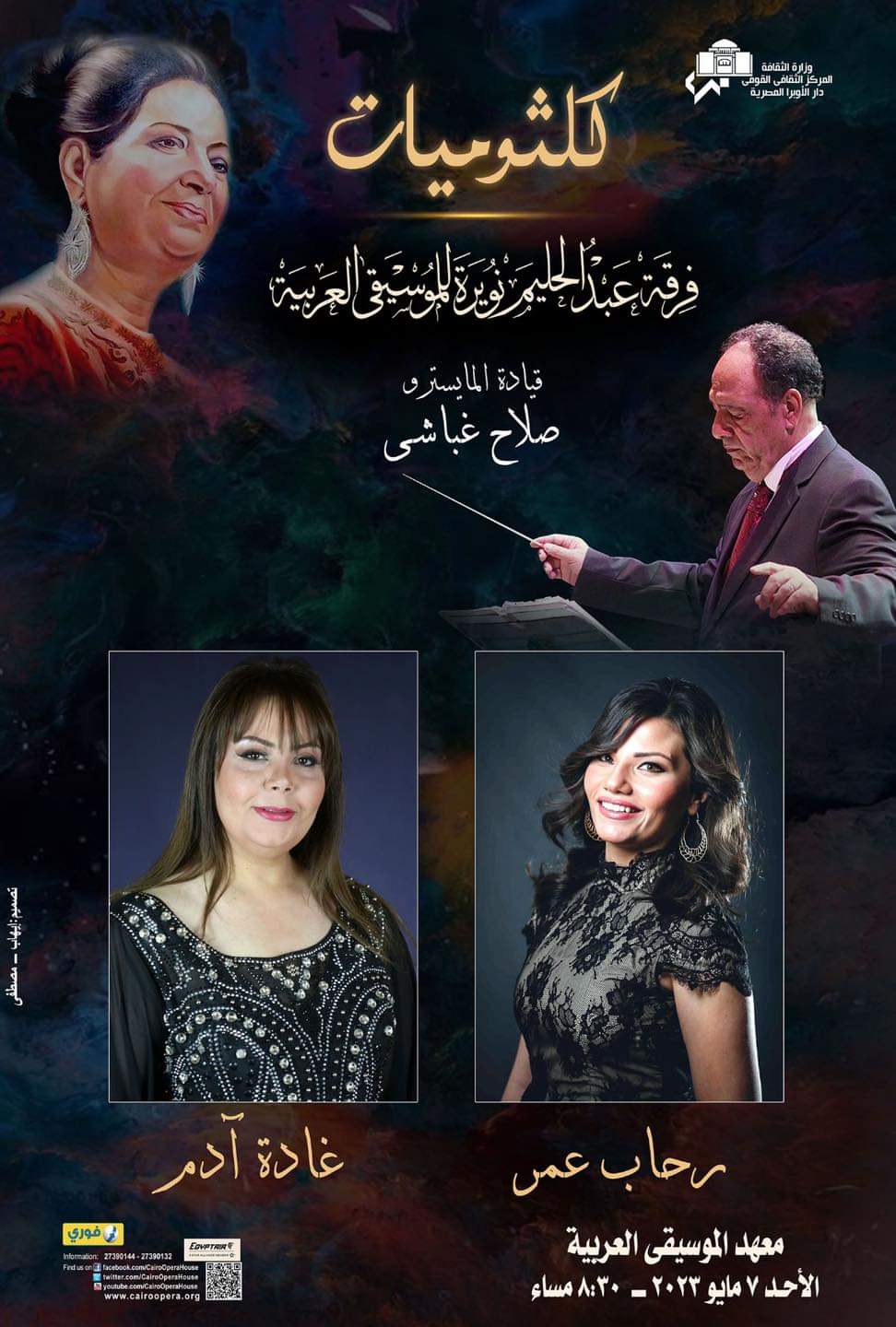 يستضيف مسرح معهد الموسيقي العربية حفل كلثوميات تقدمها فرقة عبد الحليم نويرة للموسيقى العربية بمشاركة نجوم الفرقة وقيادة المايسترو صلاح غباشي.. يوم الأحد 7 مايو 8:30 م.