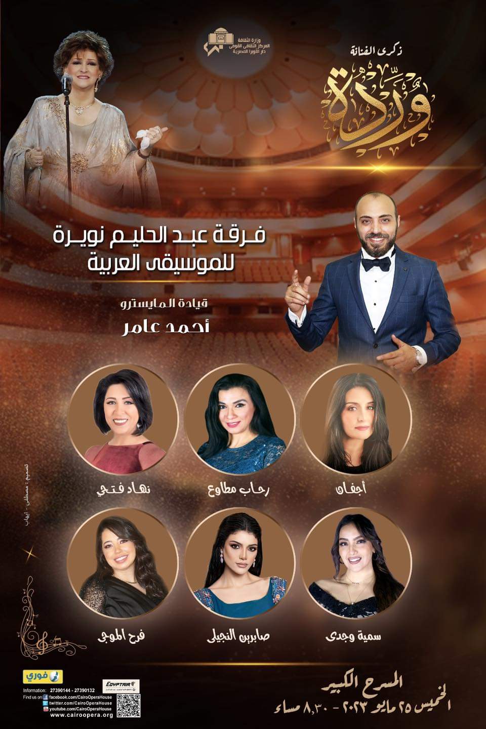 يقيم المسرح الكبير بدار الأوبرا المصرية احتفالية بذكرى الفنانة وردة، مع فرقة عبد الحليم نويرة للموسيقى العربية بمشاركة نجوم الفرقة وقيادة المايسترو أحمد عامر، يوم الخميس 25 مايو الساعة 8:30 م.