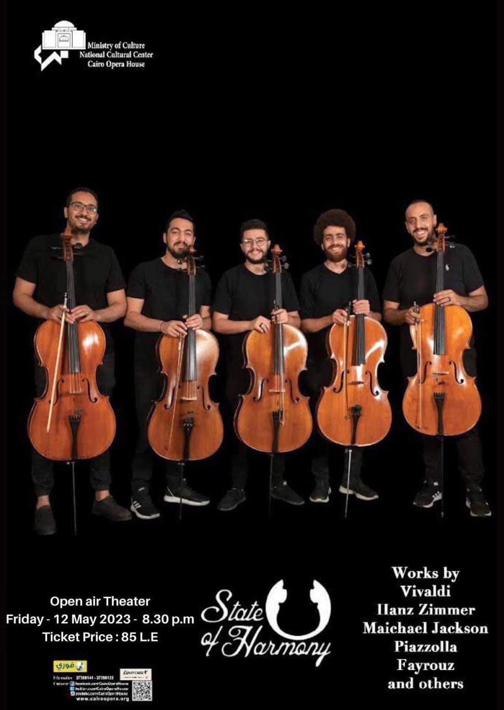 كما تُقيم حفل مجموعات الأوبرا لموسيقى الحجرة - مجموعة التشيللو State of Harmony على المسرح المكشوف يوم الجمعة 12 مايو 2023 - 8:30 مساء.