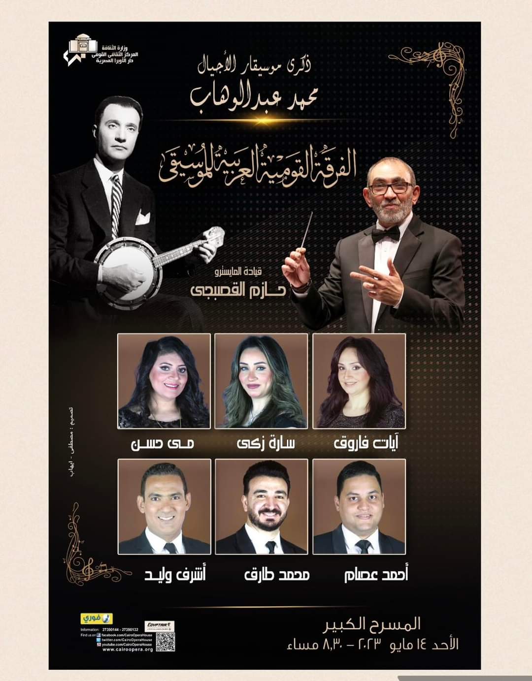 كما تحتفل دار الأوبرا على خشبة المسرح الكبير بذكري موسيقار الأجيال محمد عبد الوهاب، تقدمه الفرقة القومية العربية للموسيقى بمشاركة نجوم الفرقة وقيادة المايسترو حازم القصبجي، يوم الأحد ١٤ مايو الساعة ٨:٣٠ م.