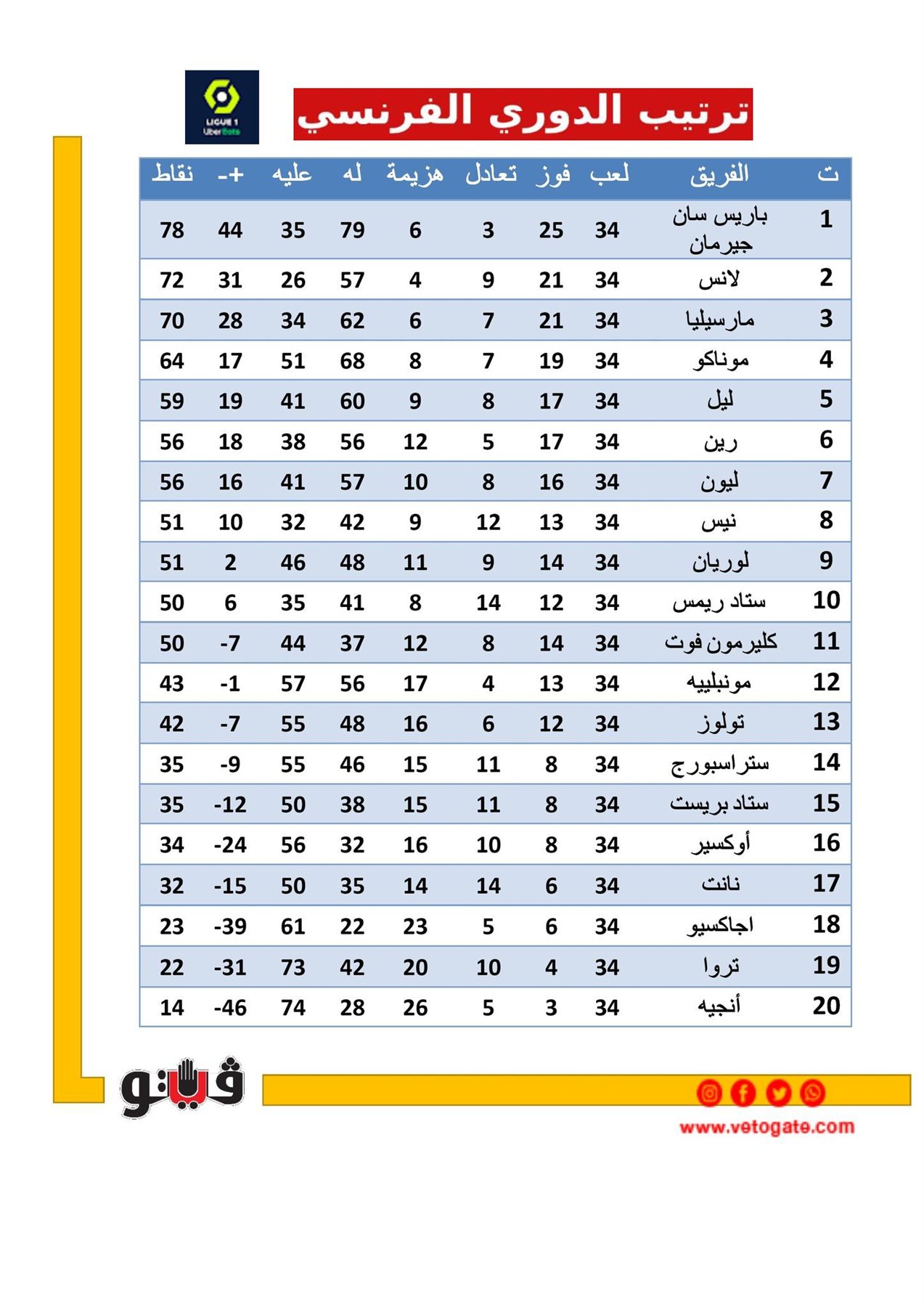 ترتيب الدوري الفرنسي، يتصدر باريس سان جيرمان جدول ترتيب الدوري الفرنسي، برصيد 78 نقطة بعد فوزه علي تروا 3-1 في الجولة الـ 34 من البطولة.