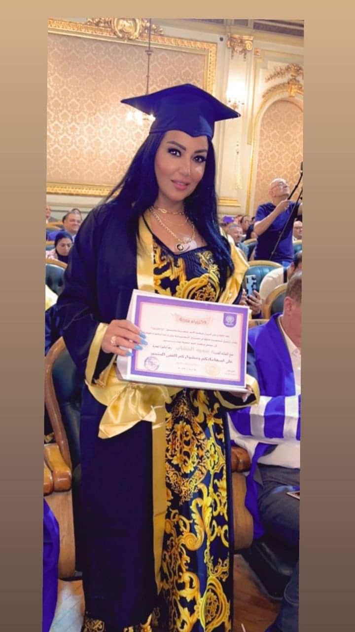 أطلت النجمة سمية الخشاب بـ روب التخرج عقب منحها الدكتوراه الفخرية من الأمم المتحدة للفنون.