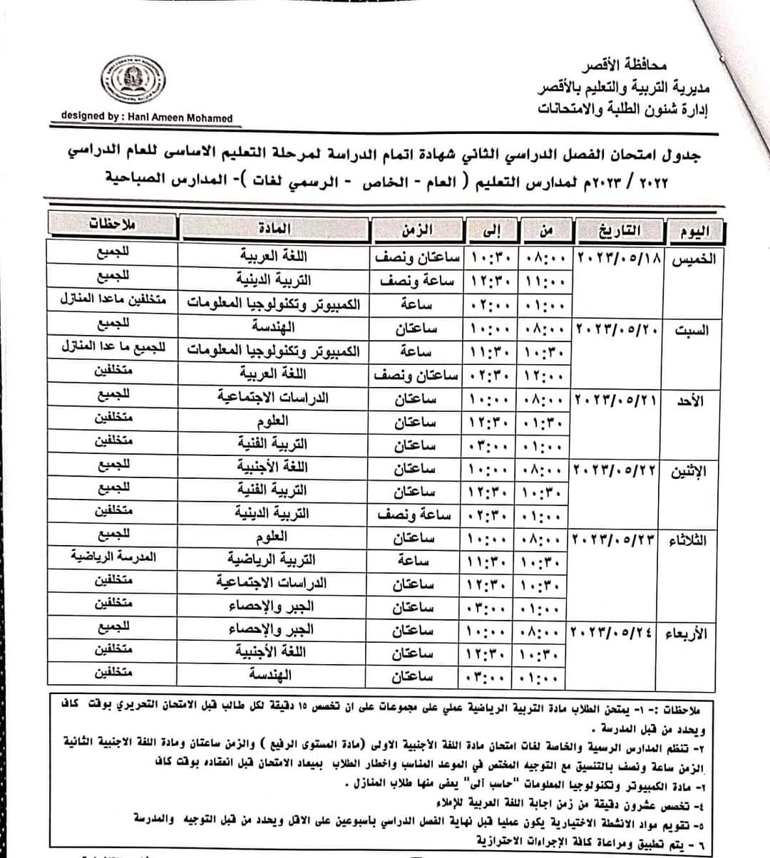 وتنشر بوابة “فيتو” صور جدول امتحانات مرحلة التعليم الأساسي بمحافظة الأقصر