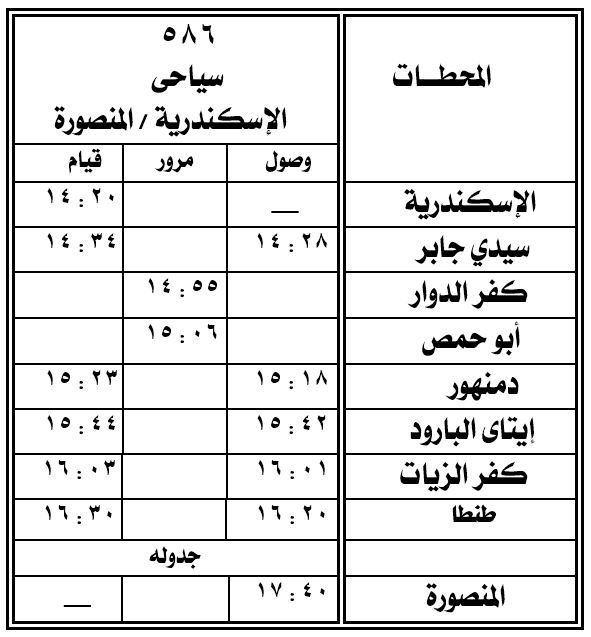 وكذلك تقرر اعتبارًا من يوم الأربعاء الموافق 10 / 5 / 2023 يتم إلغاء وقوف قطار ( 586 / 587 ) بمحطة كفر الدوار كالجدول المرفق.