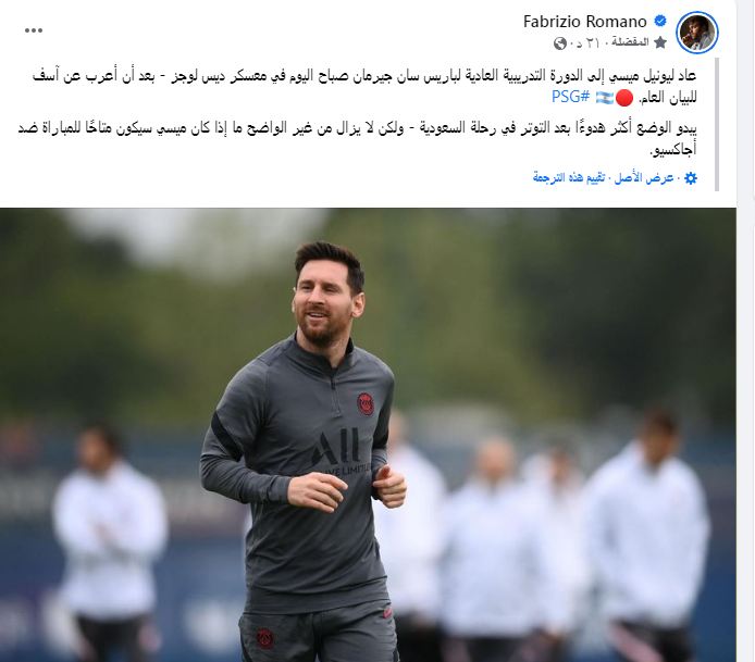 عاد الأرجنتيني ليونيل ميسي إلى تدريبات باريس سان جيرمان صباح اليوم في معسكر الفريق، وذلك بعد إيقافه من قبل إدارة النادي لمدة أسبوعين من خوض المباريات مع الفريق الباريسي بعد رحيله المفاجئ لزيارة سياحية في المملكة العربية السعودية.