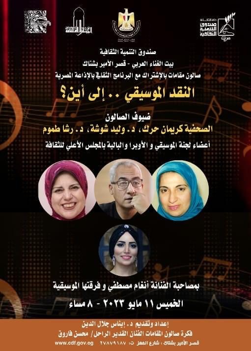 يقيم قصر الأمير بشتاك التابع لقطاع صندوق التنمية الثقافية فى الثامنة مساء الخميس 11 مايو الجاري، "صالون مقامات" والذي يقام هذا الشهر تحت عنوان "الموسيقى إلى أين".