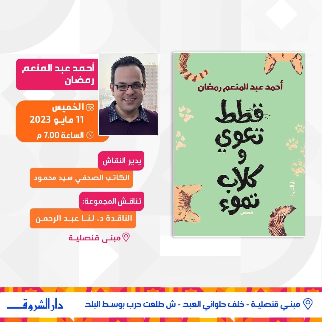 تنظم دار الشروق للنشر والتوزيع في تمام السابعة من مساء يوم الخميس المقبل الموافق 11 مايو الجاري، حفل توقيع ومناقشة للمجموعة القصصية "قطط تعوي وكلاب تموء" للكاتب أحمد عبد المنعم رمضان وذلك بمبنى قنصلية في وسط القاهرة.