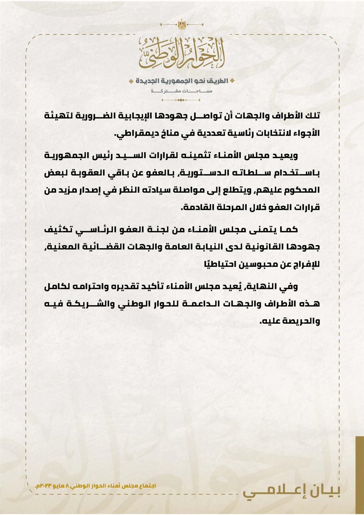 وأكد مجلس مجلس الأمناء فى بيانه، أنه يأمل من كل هذه الأطراف والجهات أن تواصل دعمها للحوار الوطني ووقوفها وراءه بكل ما تملك من أدوات وسُبل، وأن تُعطِي الحوار فرصة ووقتًا مناسبًا ومعقولًا؛ لكي يصل من خلال جلساته إلى مقترحات تفصيلية محددة تُرفَع لرئيس الجمهورية في المحاور الثلاثة، وخصوصًا فيما يتعلق بالموضوعات ذات الطابع الاقتصادي.