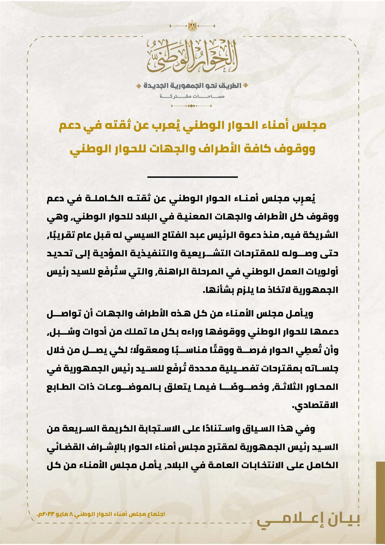 أعرب مجلس أمناء الحوار الوطني عن ثقته الكاملة في دعم ووقوف كل الأطراف والجهات المعنية في البلاد إلى جانب الحوار الوطني، وهي شريكة فيه، منذ دعوة الرئيس عبد الفتاح السيسي إليه قبل عام تقريبًا، وصولا إلى المقترحات التشريعية والتنفيذية المؤدية إلى تحديد أولويات العمل الوطني في المرحلة الراهنة، التي سترفَع لرئيس الجمهورية لاتخاذ ما يلزم بشأنها.