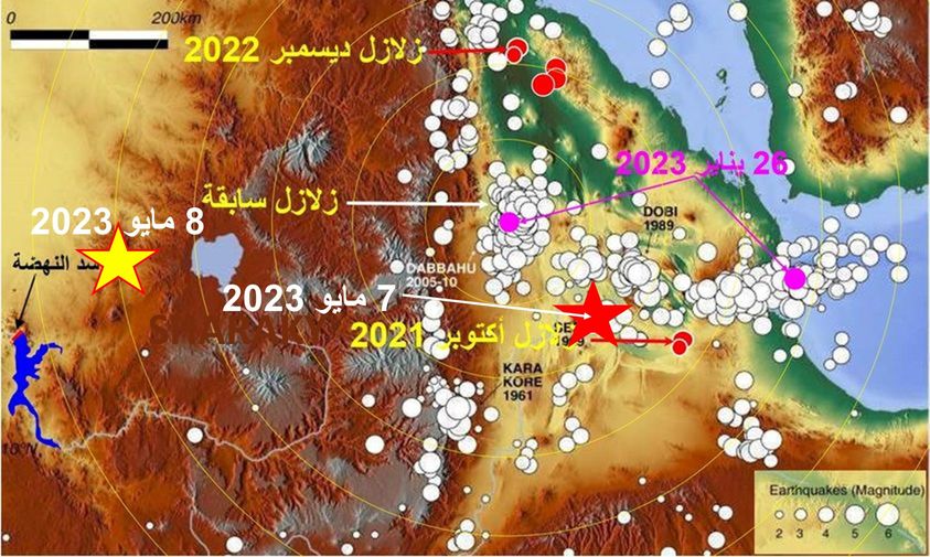 وأضاف الدكتور عباس شراقي أن زلزالًا آخر أقوى قليلًا 4.8 ريختر ضرب إثيوبيا، على عمق 10 كيلو متر أيضًا ساحل جيبوتي في نفس نطاق الأخدود الأفريقي العظيم، ويبعد 800 كيلومتر عن سد النهضة.