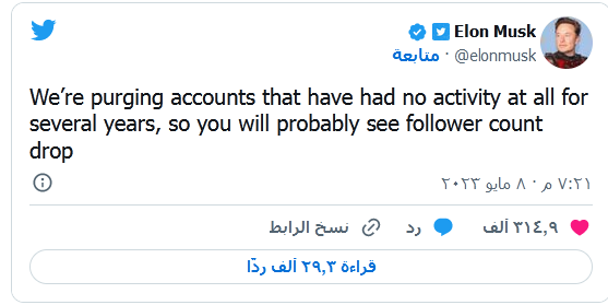 وقال الملياردير ماسك في تغريدته: "سنُطهِّر الحسابات التي لم يكن لها أي نشاط خلال السنوات العديدة الماضية، لذا من المحتمل أن تشهد انخفاضًا في عدد المتابعين".