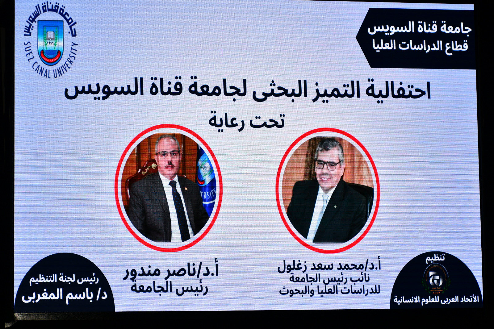 شهد الدكتور ناصر مندور رئيس جامعة قناة السويس، احتفالية التميز البحثي للجامعة والتي نظمها قطاع الدراسات العليا والبحوث بالجامعة، بالتعاون مع الاتحاد العربي للعلوم الإنسانية والتنمية.