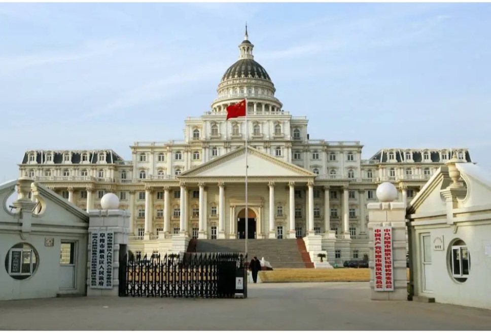 تلك النسخ المقلدة الصينية منتشرة في جميع أنحاء الصين الآن على الرغم من أننا لا نحب نسخ عمل شخص آخر فإن المرء يتذكر أن العديد من المباني الأثرية في العالم يمكن القول إنها منسوخة من بعضها البعض البيت الأبيض على سبيل المثال لديه العديد من الميزات المشتركة مع مبنى البرلمان الأيرلندي في دبلن والذي كان بدوره مستوحى من العمارة الرومانية الكلاسيكية .