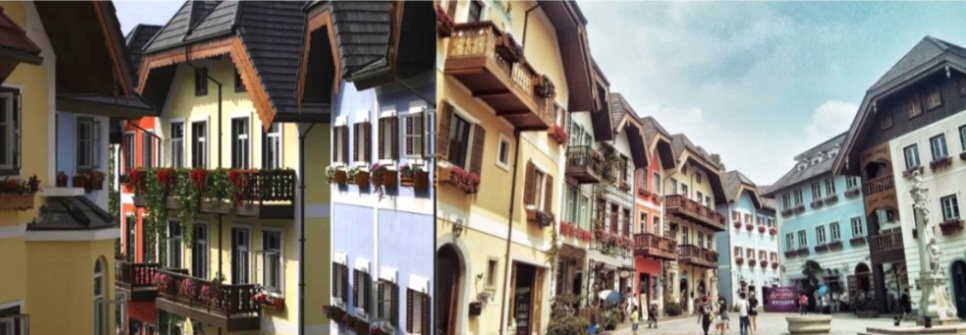 لم تكتف الصين بتكرار المباني الشهيرة فحسب، بل قامت أيضًا بنسخ الأنماط المعمارية من المدن الإنجليزية كما هو موضح أدناه من بلدة التايمز التي تقع على بعد 40 دقيقة من وسط مدينة شنغهاي يذكر أن المنازل في مدينة التايمز تباع بسرعة ومع ذلك لم تصل الطبقة الوسطى على النحو المنشود بسبب الانهيار العقاري في الصين الذي جعل أسعار المنازل بعيدة عن متناول معظم سكان شنغهاي وبدلًا من ذلك تم شراء معظمها كاستثمارات أو منازل ثانية من قبل الصينيين الأثرياء مما جعل مدينة التايمز شبحًا. أسفل كما هو موضح.