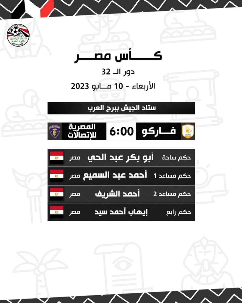 كأس مصر، أعلنت لجنة الحكام الرئيسية باتحاد الكرة المصري، أسماء حكام مباريات اليوم الأربعاء ضمن مواجهات دور الـ 32 ببطولة كأس مصر للموسم الحالي 2022 - 2023 على النحو التالي: