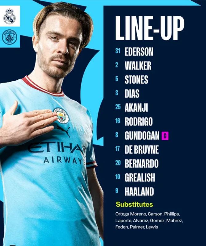 واعتمد الإسباني بيب جوارديولا، المدير الفني لفريق مانشستر سيتي، على ثلاثي هجوم بقيادة أرلينج هالاند خلال مواجهة ريال مدريد في نصف نهائي دوري أبطال أوروبا، حيث جاء تشكيل الفريق الإنجليزي كالتالي: