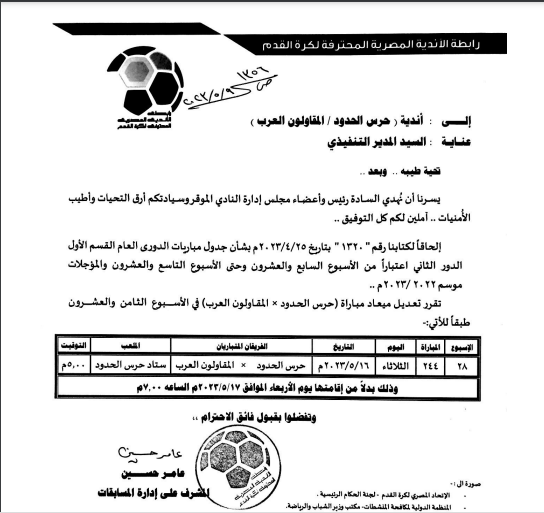 وتلقى نادي المقاولون العرب خطابا رسميا من رابطة الأندية تخطره بالموعد الجديد لمباراة الفريق الأول لكرة القدم أمام نظيره حرس الحدود.