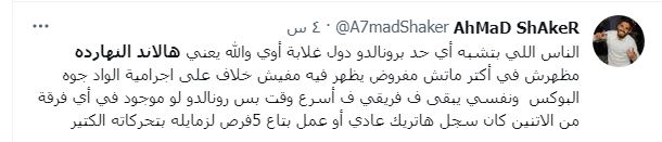 وغرد حساب أحمد شاكر قائلًا: الناس اللي بتشبه أي حد برونالدو دول غلابة أوي والله يعني هالاند النهارده ما ظهرش في أكتر ماتش مفروض يظهر فيه مفيش خلاف على إجرامية الواد جوه البوكس ونفسي يبقى في فريقي في أسرع وقت بس رونالدو لو موجود في أي فرقة من الاتنين كان سجل هاتريك عادي أو عمل بتاع 5 فرص لزمايله بتحركاته الكتير.