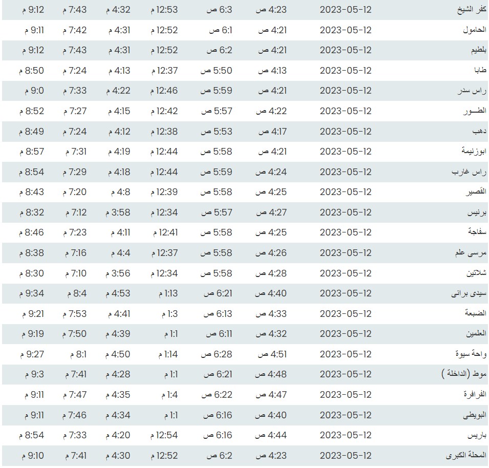 مواقيت الصلاة اليوم وفقًا للتوقيت المحلي لمدينتي القاهرة والإسكندرية وعدد من مدن ومحافظات الجمهورية من واقع بيانات الهيئة العامة للمساحة