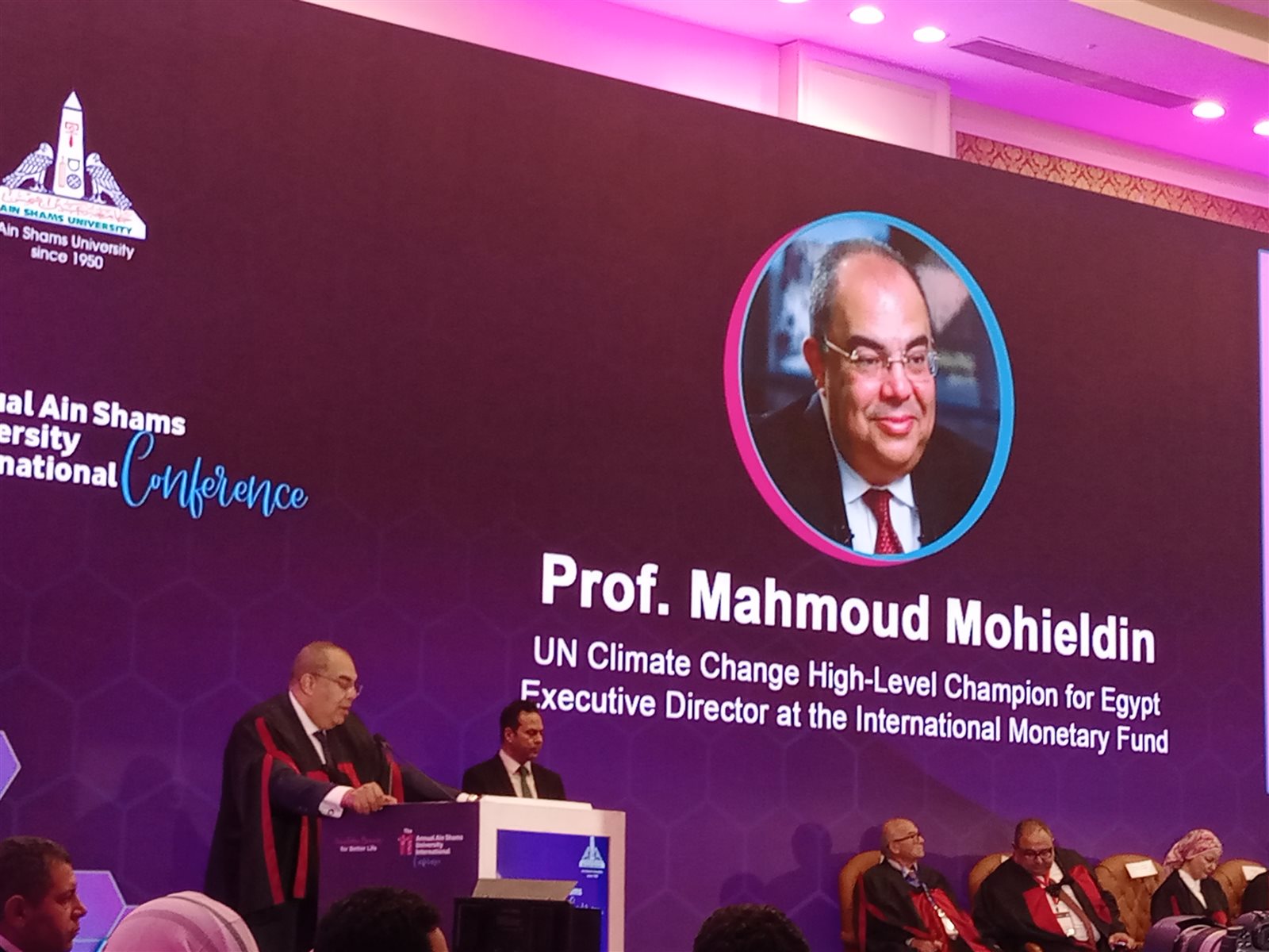 تقدم الدكتور محمود محيي الدين، المدير التنفيذي لصندوق النقد الدولي ومدير الأمم المتحدة المعني بتغير المناخ، بالشكر علي تكريمه من جامعة عين شمس علي منحه الدكتوراه الفخرية.