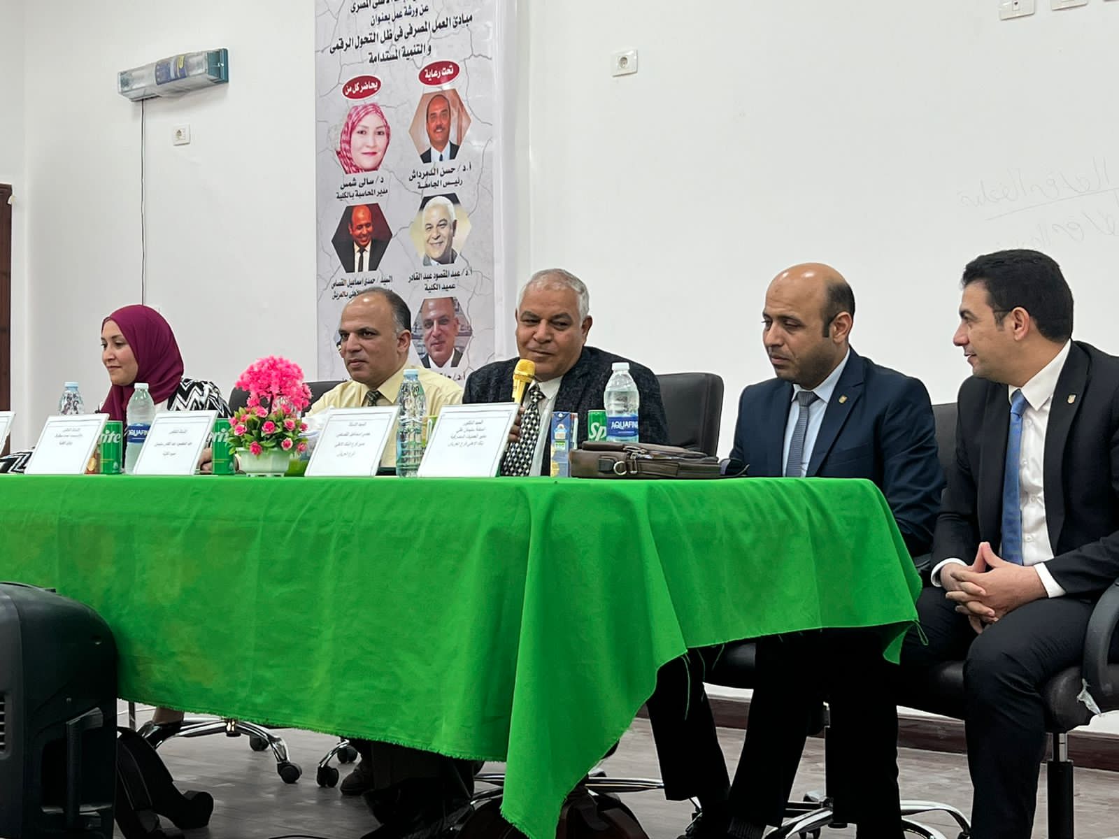 عقدت كلية التجارة بجامعة العريش ورشة عمل بالتعاون مع البنك الأهلى المصري تحت عنوان: "مبادئ العمل المصرفى فى ضوء التحول الرقمى والتنمية المستدامة".