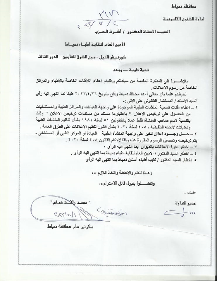 جاء ذلك بناءا علي مذكرة تم تقدميها من الدكتور أشرف العزب امين عام نقابة اطباء دمياط طالب فيها اعفاء اللافتات الخاصة بالأطباء والمراكز الخاصة من رسوم الإعلانات.