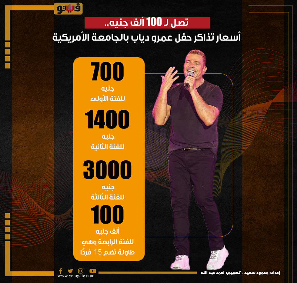 تصل لـ 100 ألف جنيه.. أسعار تذاكر حفل عمرو دياب بالجامعة الأمريكية (إنفوجراف) الأربعاء 10/مايو/2023 - 09:08 م 5/10/2023 9:08:02 PM عمرو دياب، فيتو محمود سعيد شارك طباعة 18 حجم الخط شارك طباعة حفل عمرو دياب بالجامعة الأمريكية حفل عمرو دياب اسعار تذاكر حفل عمرو دياب عمرو دياب النجم عمرو دياب الجامعة الامريكية