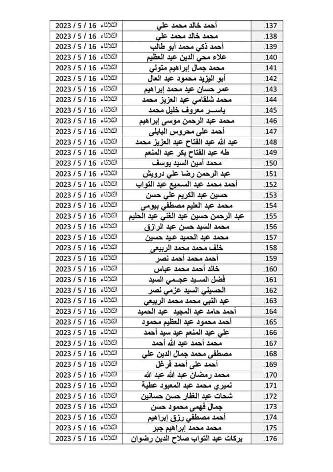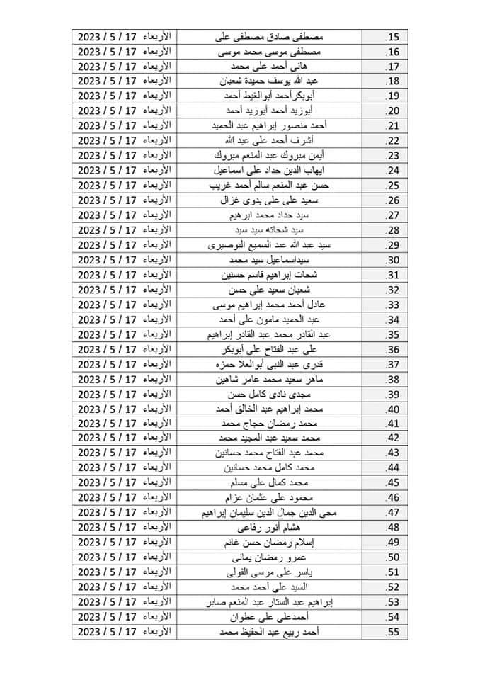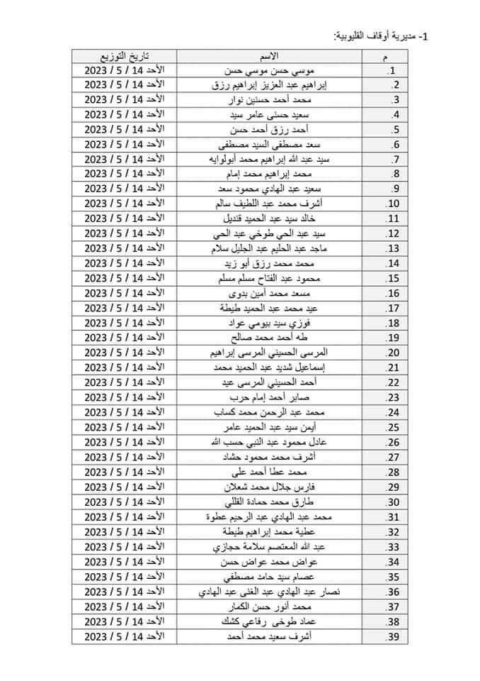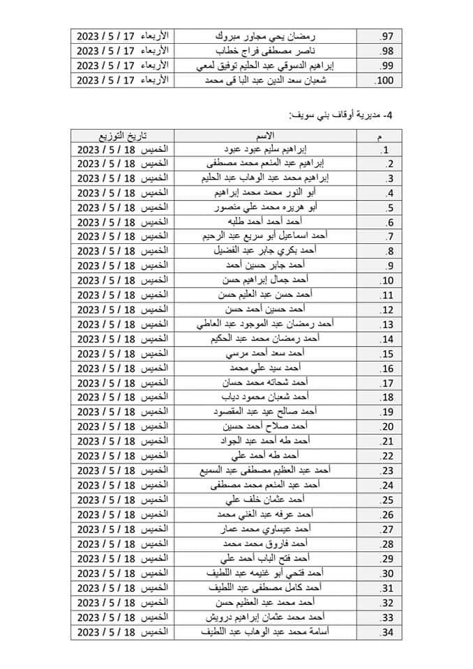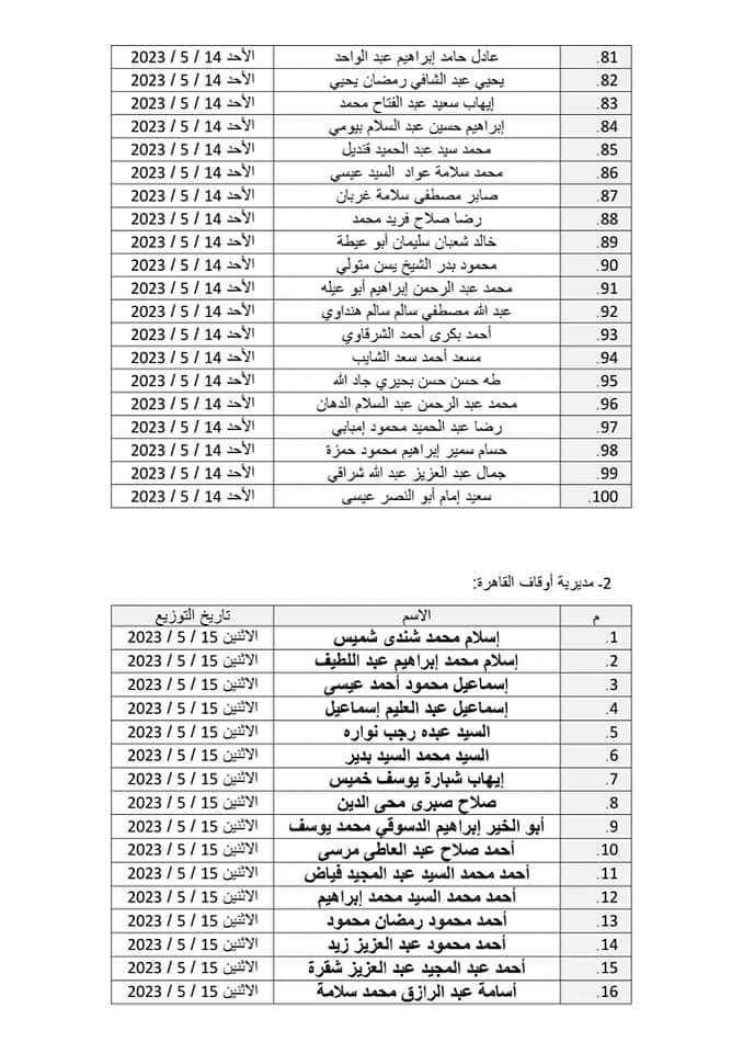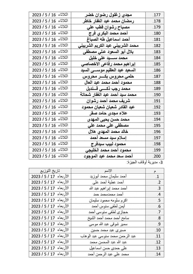 وعلى مديري المديريات التنبيه على الآتية أسماؤهم بالتوجه لاستلام الزي الأزهري بمسجد الرحمة بجوار ديوان عام الوزارة في الموعد المحدد أمام كل منهم، مع وجود مسئول الزي بكل مديرية ( المخازن )، علمًا بأن التوزيع سيتم بدءًا من يوم الأحد 14 / 5 / 2023م حتى يوم الخميس 18 / 5 / 2023م، من الساعة التاسعة صباحًا حتى الساعة الثانية والنصف عصرًا، وذلك على النحو التالي: