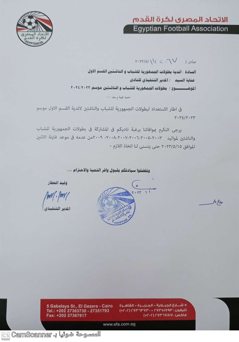 وأخطر اتحاد الكرة أندية الدوري الممتاز، بموافاة الجبلاية بالرغبة في المشاركة ببطولات دوري الجمهورية للناشئين والشباب موسم 2023-2024 في موعد غايته 15 مايو الجاري.