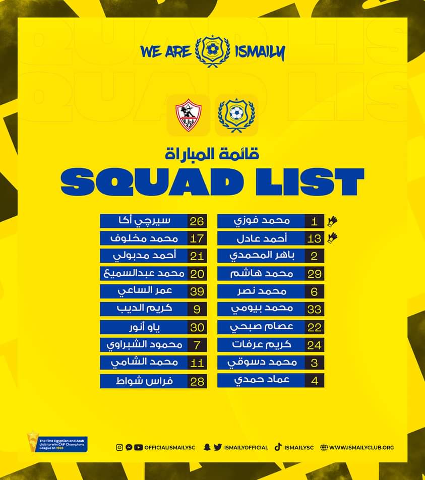 حيث شهدت قائمة الإسماعيلي غياب كل من.. محمد كوكو – محمد حسن – عبد الرحمن مجدي لأسباب مختلفة، بينما عاد محمد عبد السميع.