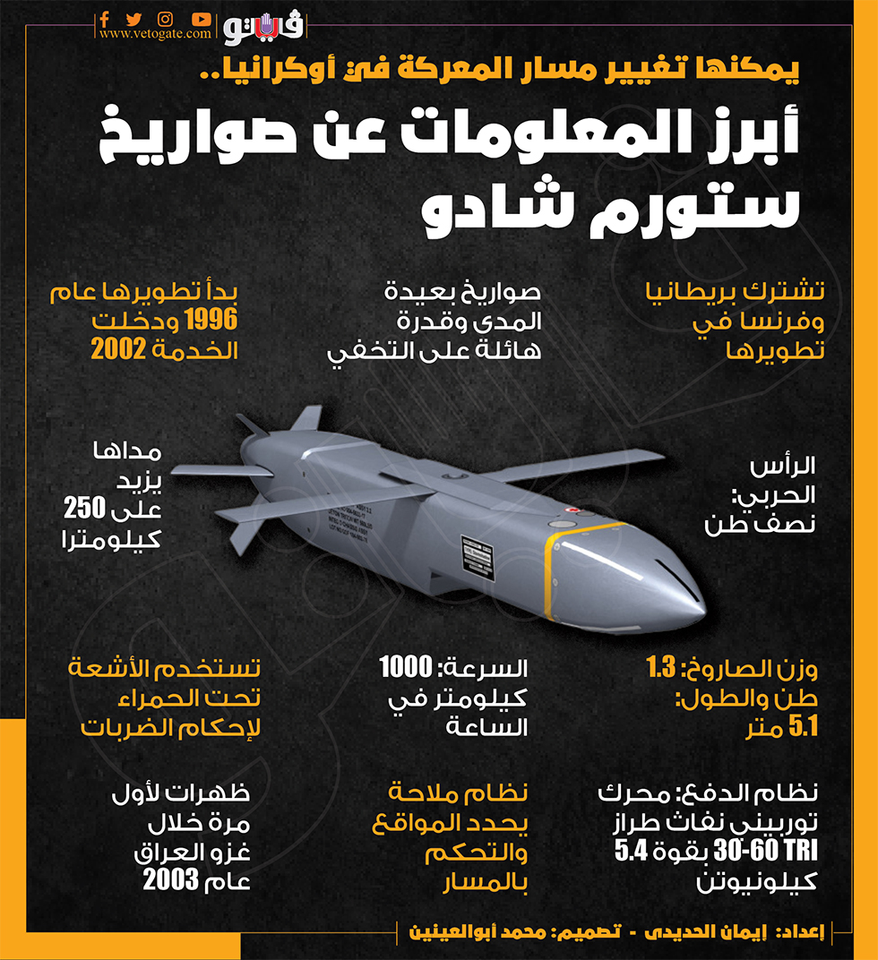 يمكنها تغيير مسار المعركة في أوكرانيا، أبرز المعلومات عن صواريخ ستورم شادو الجمعة 12/مايو/2023 - 03:03 م 5/12/2023 3:03:50 PM صواريخ ستورم شادو، فيتو إيمان الحديدى شارك طباعة 18 حجم الخط شارك طباعة صواريخ ستورم شادو صواريخ بعيدة المدى فرنسا وزارة الدفاع البريطانية