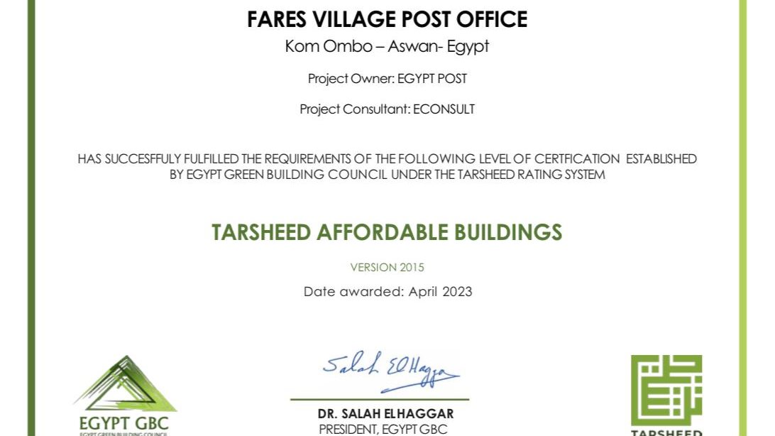 اوضح أن حصول البريد المصري على هذه الشهادة جاء بعد مراجعة المجلس المصري للمباني الخضراء واعتماد الشهادة من المجلس العالمى للمبانى الخضراء؛ وذلك بعد مرور مكتب بريد فارس بمدينة أسوان بالعديد من المراجعات أثناء التصميم وبعد التنفيذ، والتي شملت ثلاثة جوانب رئيسية، تؤكد مدى التزام المكتب بالشروط البيئية ومبادئ الاستدامة وهى ترشيد استخدام الطاقة من خلال التصميم الفعال واختيار الخامات والمعدات الموفرة للطاقة، وترشيد استهلاك المياه بما يتناسب مع محيط المبنى وحث المستخدمين على ترشيد استهلاك المياه وموارد الطاقة، وتعزيز بيئة عمل صحية من خلال تقليل استخدام الخامات والمواد المستوردة غير الضرورية، وتعظيم استخدام مواد البناء من البيئة المحيطة وكذلك المواد المعاد تدويرها والصديقة للبيئة بالإضافة إلى إجراء الاختبارات التي تهدف إلى التأكد من تقليل الانبعاثات الكربونية.