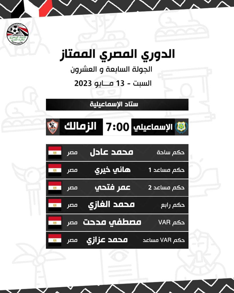 ويدير مباراة الاسماعيلي ضد الزمالك كلا من محمد عادل حكما للساحة ويعاونه كلا من هاني خيري مساعد أول وعمر فتحي مساعد ثاني ومحمد التابعي الغازي حكما رابعا ومصطفي مدحت حكم فيديو ومحمد عزازي حكم فيديو مساعد .