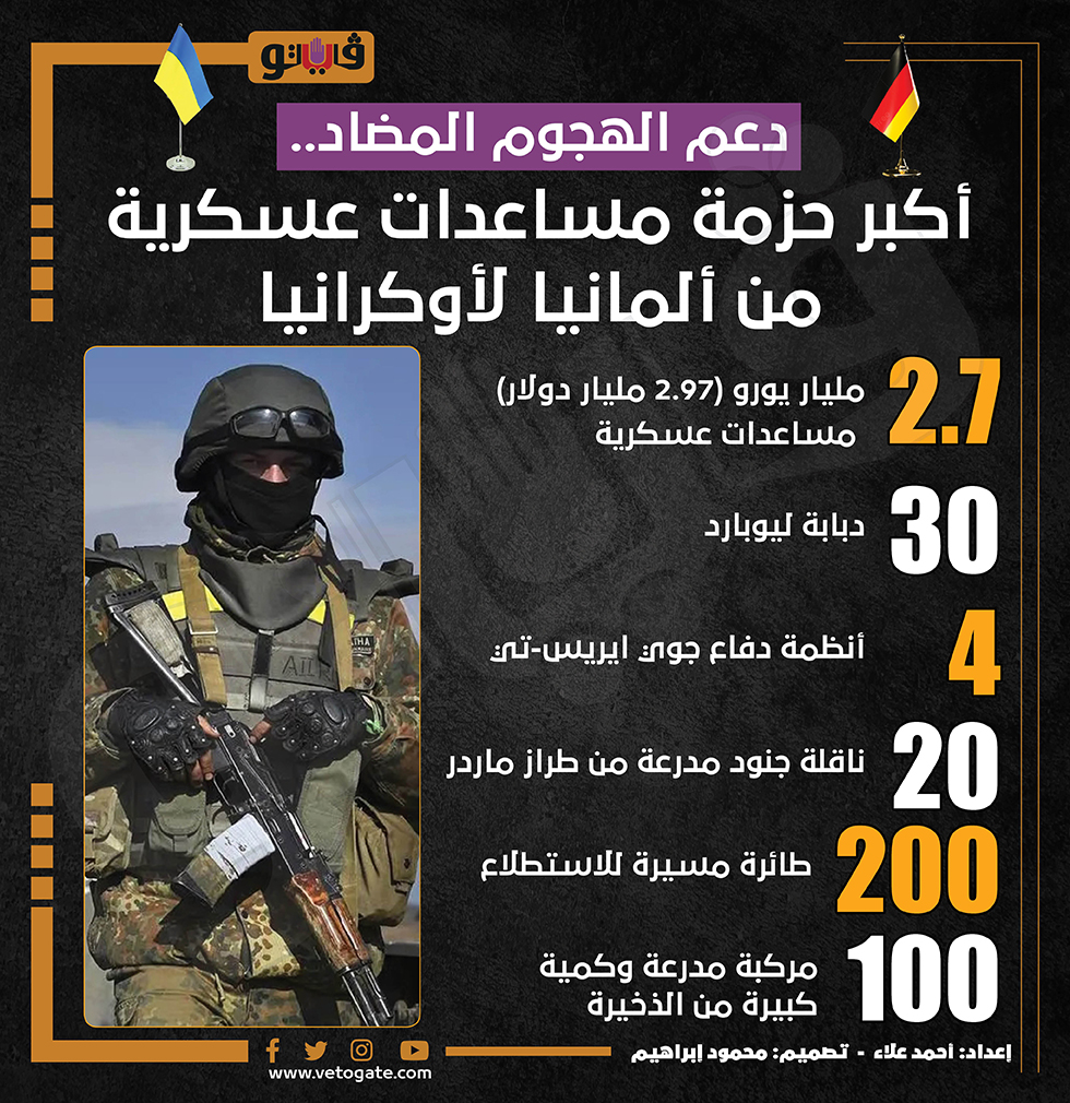 دعم الهجوم المضاد.. أكبر حزمة مساعدات عسكرية من ألمانيا لأوكرانيا (انفوجراف) السبت 13/مايو/2023 - 06:04 م 5/13/2023 6:04:24 PM دبابة ليوبارد، فيتو احمد علاء شارك طباعة 18 حجم الخط شارك طباعة ألمانيا أوكرانيا أخبار حرب روسيا و أوكرانيا دبابة ليوبارد أخبار الحرب الروسية الأوكرانية