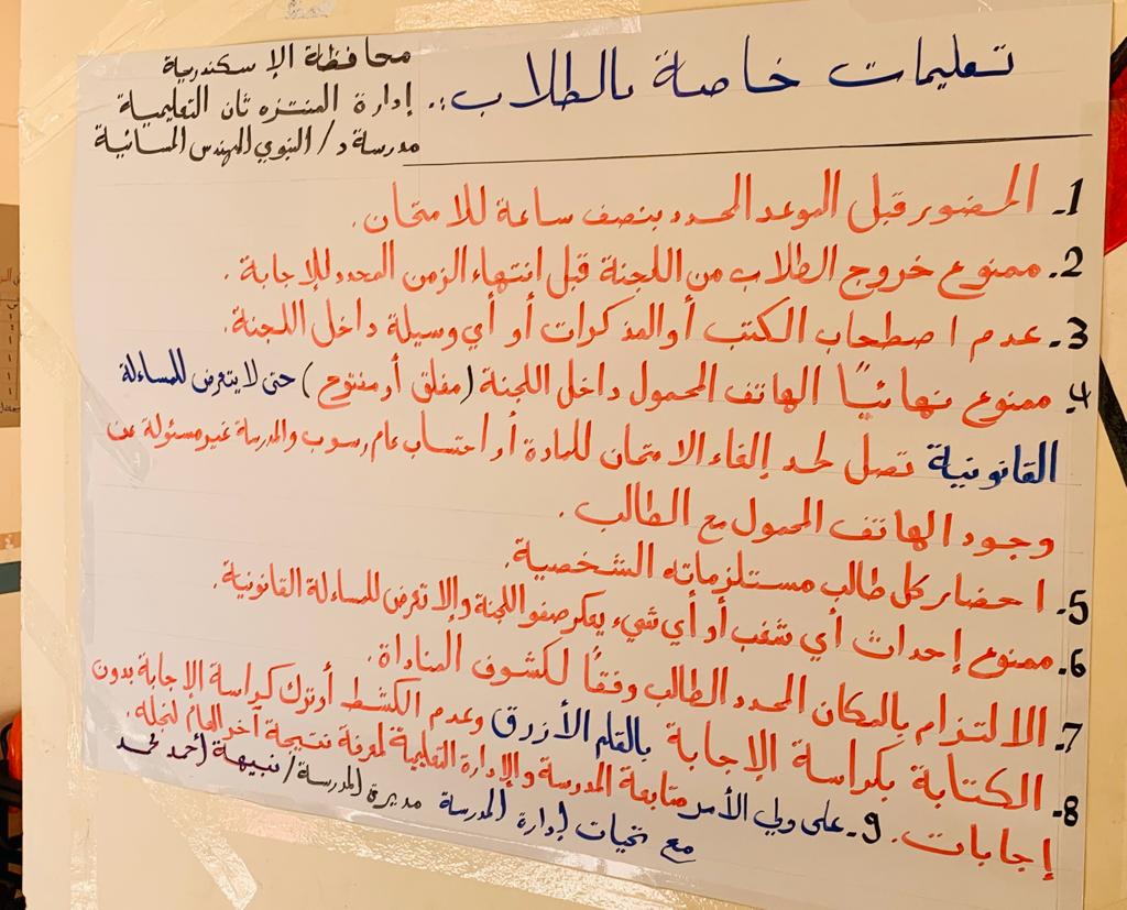 وفي سياق متصل أوضح مدير المديرية أنّ تعليم الإسكندرية قام بتجهيز غرفة عمليات بكل إدارة تعليمية لمتابعة الامتحانات وموافاة غرفة العمليات المركزية بالمديرية بالتقارير أولًا بأول، مؤكدًا على أهمية دور الموجه المقيم بكل مدرسة من حيث متابعة فتح حجرة الكنترول وفتح مظاريف الأسئلة ومدى وضوح الورقة الامتحانية ومدى كفاية عدد الملاحظين ومراقبي الأدوار وتوافر سجل الأمن وغلق بوابة المدرسة، ولم تَرِد أية شكاوى لغرفة العمليات بشأن امتحانات اليوم.