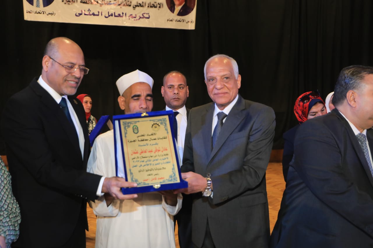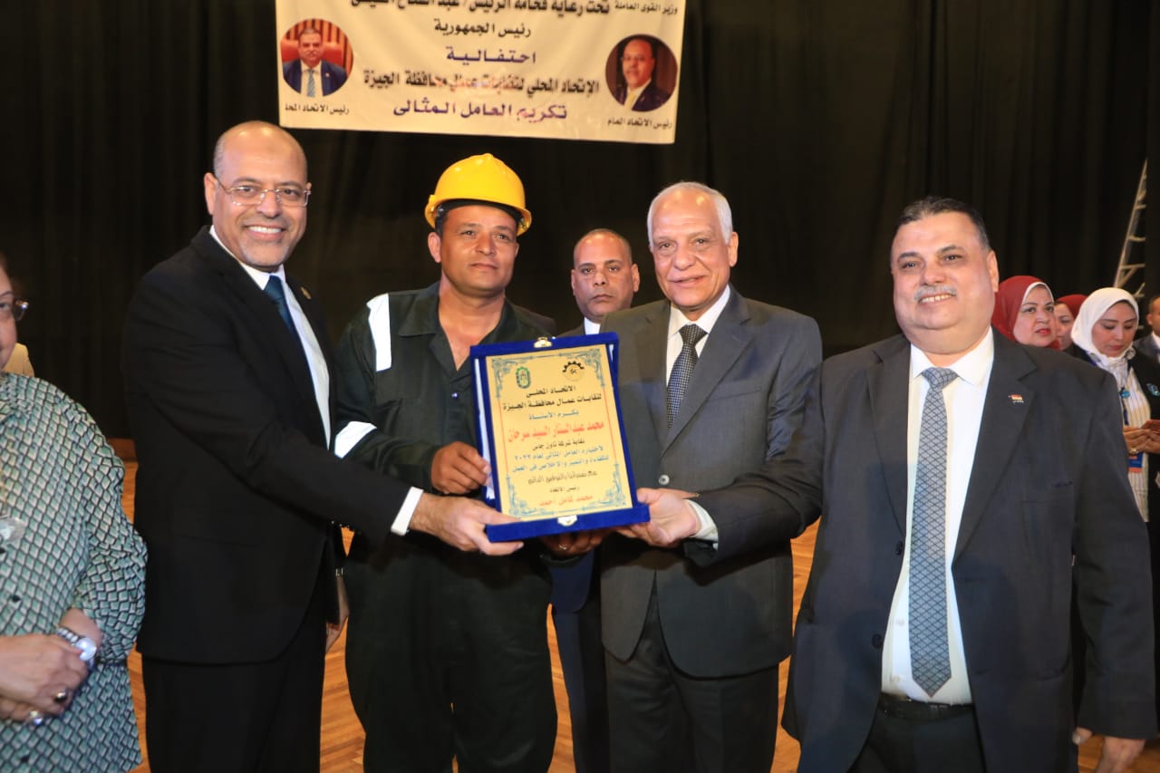 من جانبه تقدم محمد جبران رئيس الإتحاد العام لنقابات عمال مصر بالشكر الي اللواء أحمد راشد محافظ الجيزة لحرصه على الحضور لتكريم العمال موجها جميع العاملين بمواصلة الكفاح لمعاونة الدولة على إجتياز كافة التحديات الاقتصادية التى تمر بها.