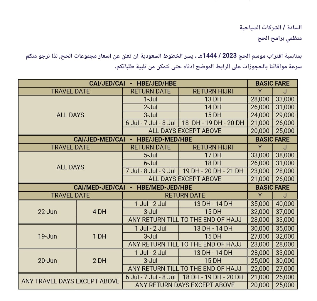 وقالت الشركة في خطابها الموجة الي شركات السياحة، أن أسعار التذاكر تبدأ من 20 الف جنيه وتصل الي 40 الف جنيه، علي أن بأن تشغيل الرحلات من مطاري القاهرة وبرج العرب الدوليين الي مطاري جدة والمدينة المنورة.