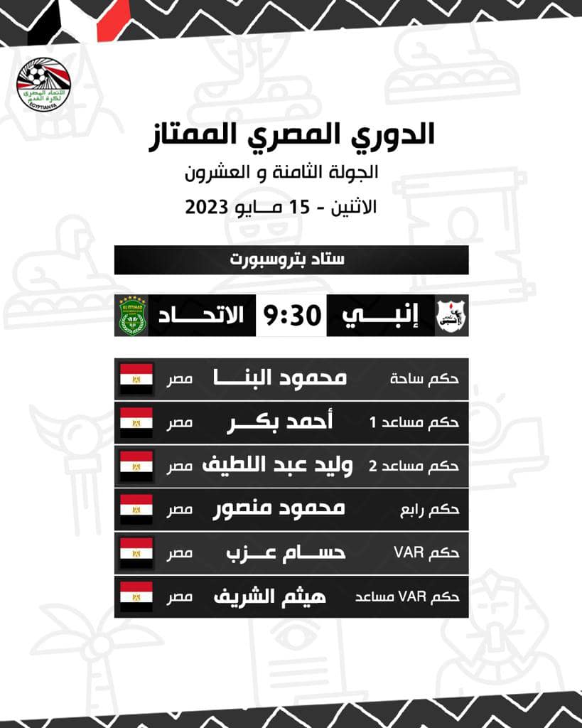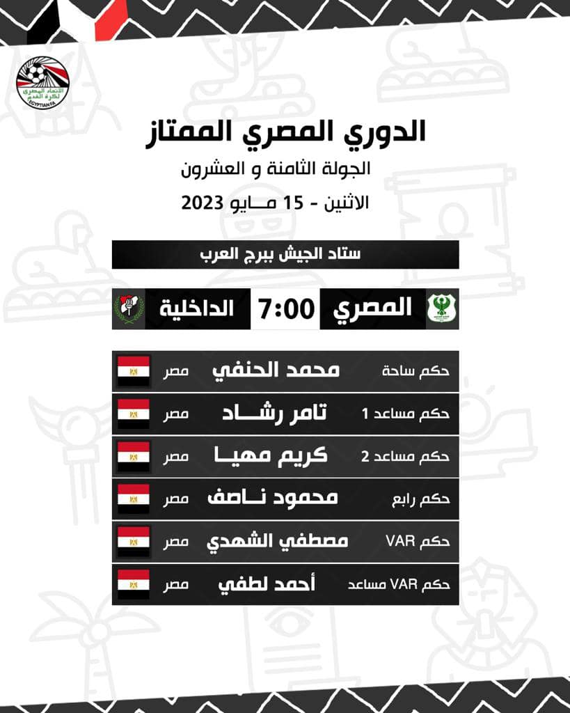الدوري الممتاز، أعلنت لجنة الحكام الرئيسية باتحاد الكرة المصري، أسماء حكام مباراتي غدا الإثنين ضمن مواجهات الجولة 28 من مسابقة الدوري الممتاز للموسم الحالي 2022 - 2023 على النحو التالي: