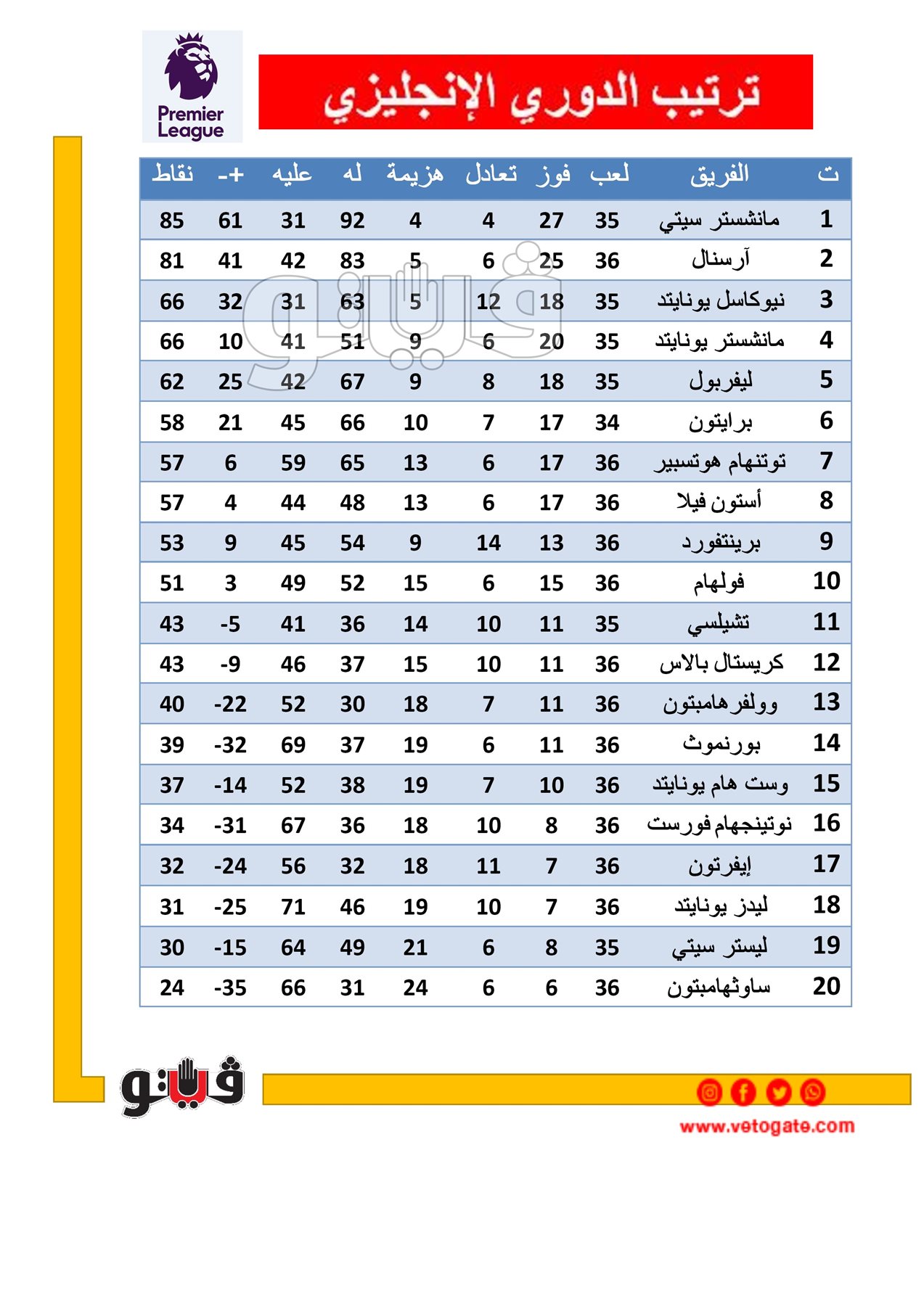 جدول ترتيب الدوري الانجليزي قبل مباراة ليفربول ضد ليستر سيتي
