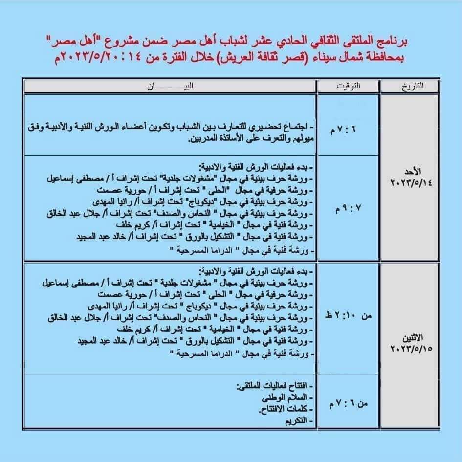 أعلنت إدارة إقليم القناة وسيناء الثقافي، برئاسة الكاتب الصحفي محمد نبيل رئيس الاقليم، عن برنامج فعاليات الملتقي الشبابى" أهل مصر" والذى يستهدف شباب المحافظات الحدودية، والذى يستضيف فعالياته قصر ثقافة العريش في محافظة شمال سيناء.