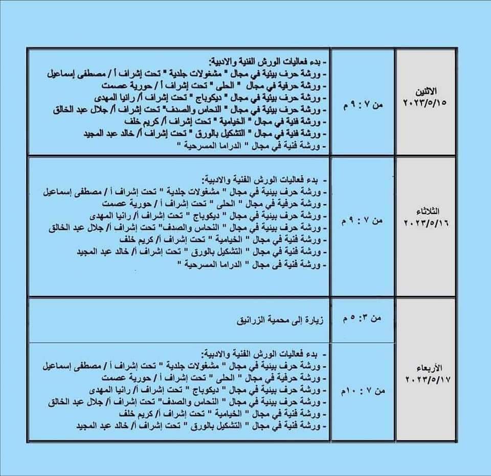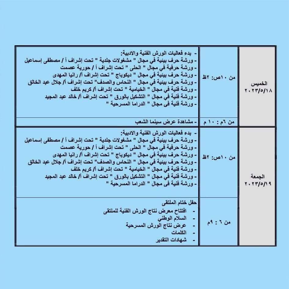 وتابع أن فعاليات الملتقى من اقليم القناة وسيناء الثقافى كل من احمد رشدى وشروق سعيد واسماء بخيت ومروة سعد وهيام مغربى ودعاء كامل ومحمد السمان وطاهر شافع وابراهيم الشحات.