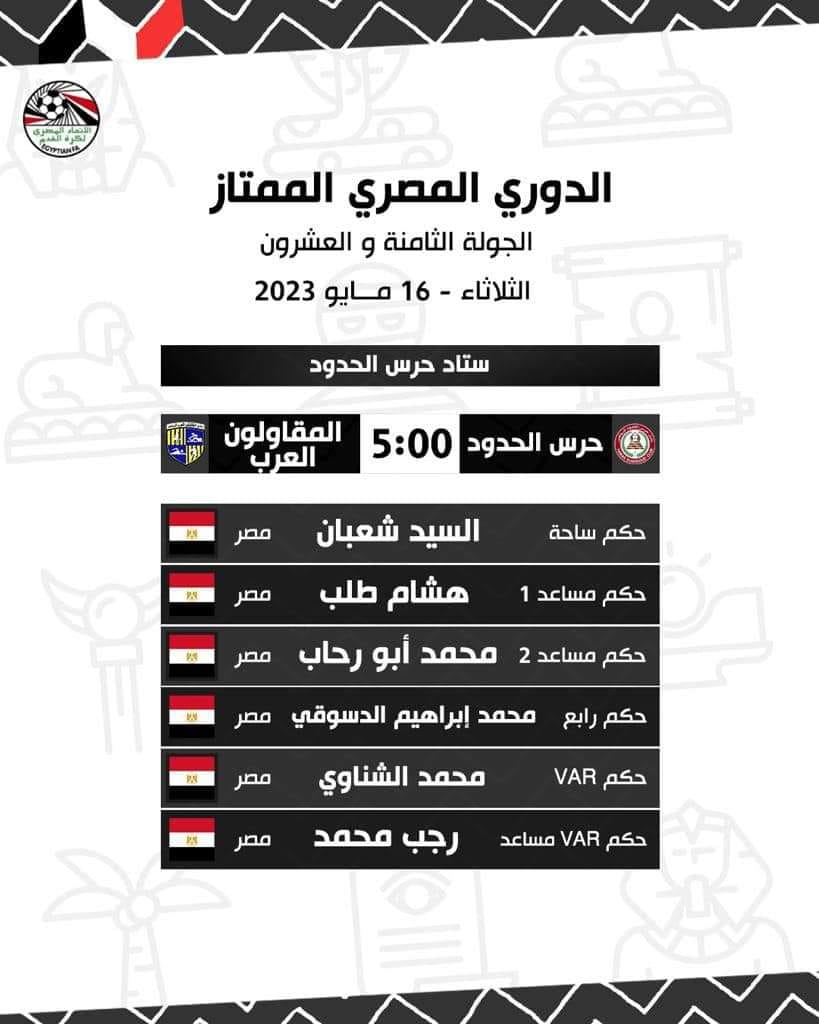 ويدير لقاء حرس الحدود ضد المقاولون طاقم حكام مكون من السيد شعبان حكما للساحة ويعاونه كلا من هشام طلب مساعد اول ومحمد ابورحاب مساعد ثاني ومحمد كابو حكما رابعا ومحمد الشناوي حكم فيديو ورجب محمد حكم فيديو مساعد .