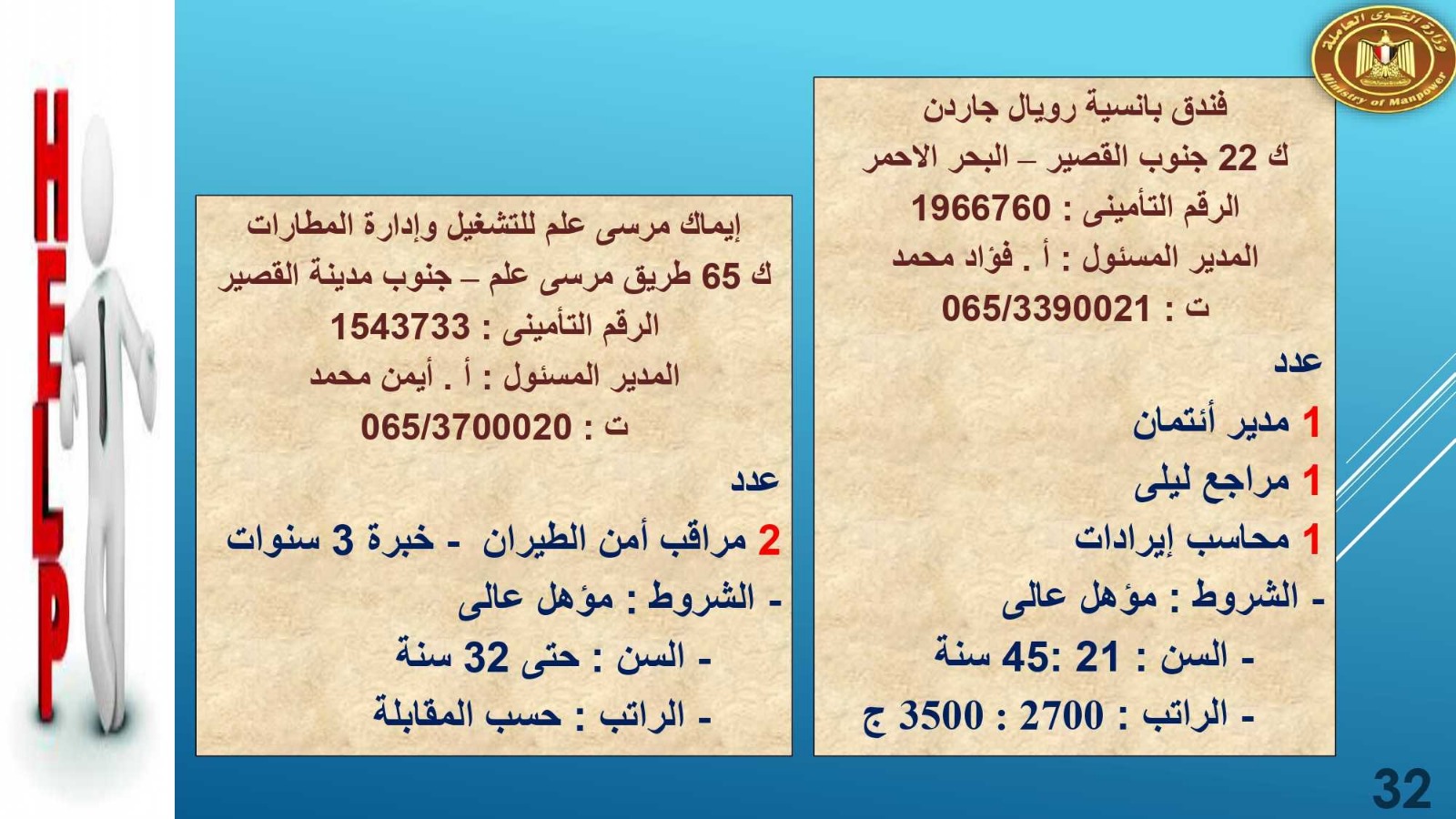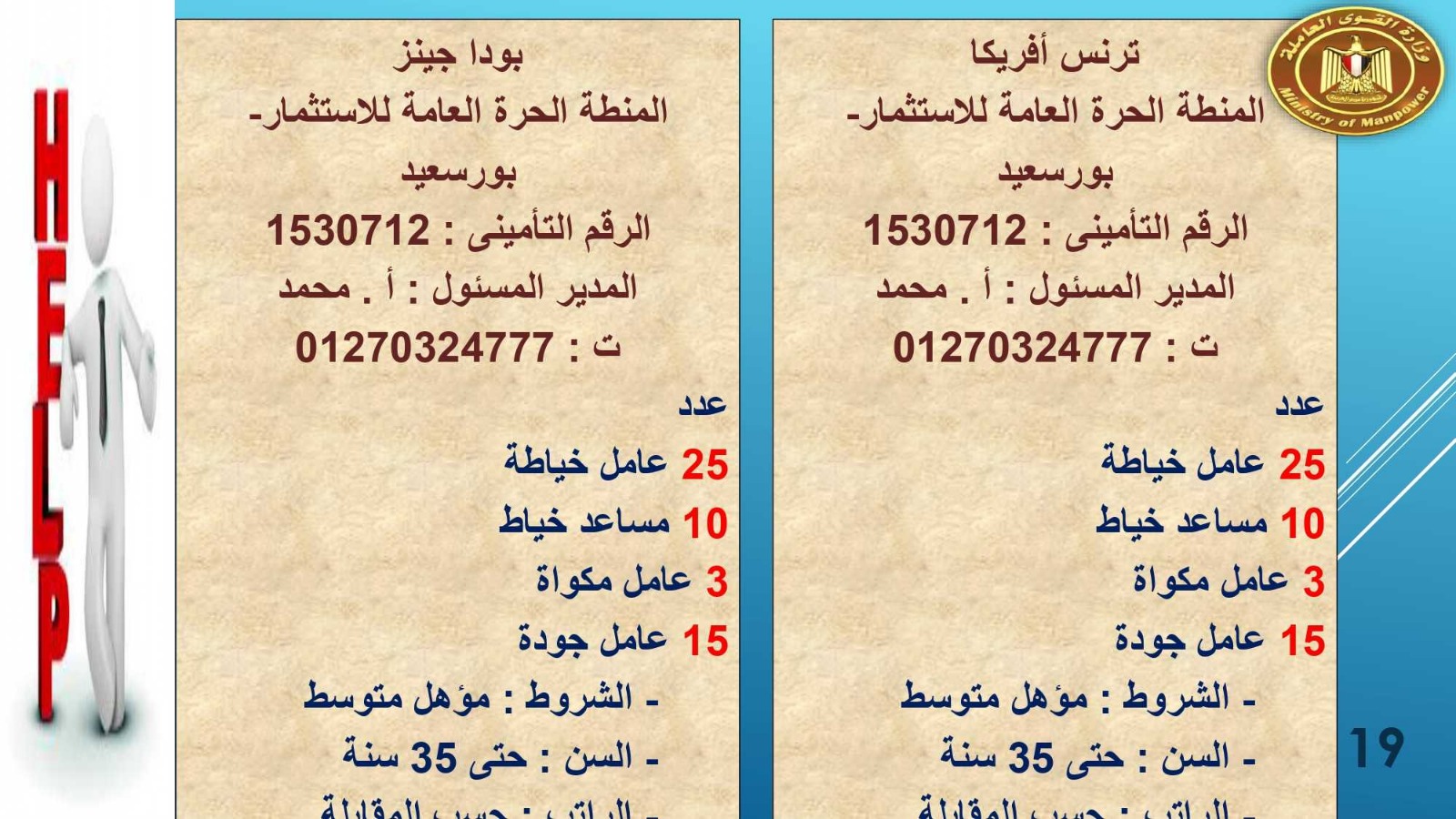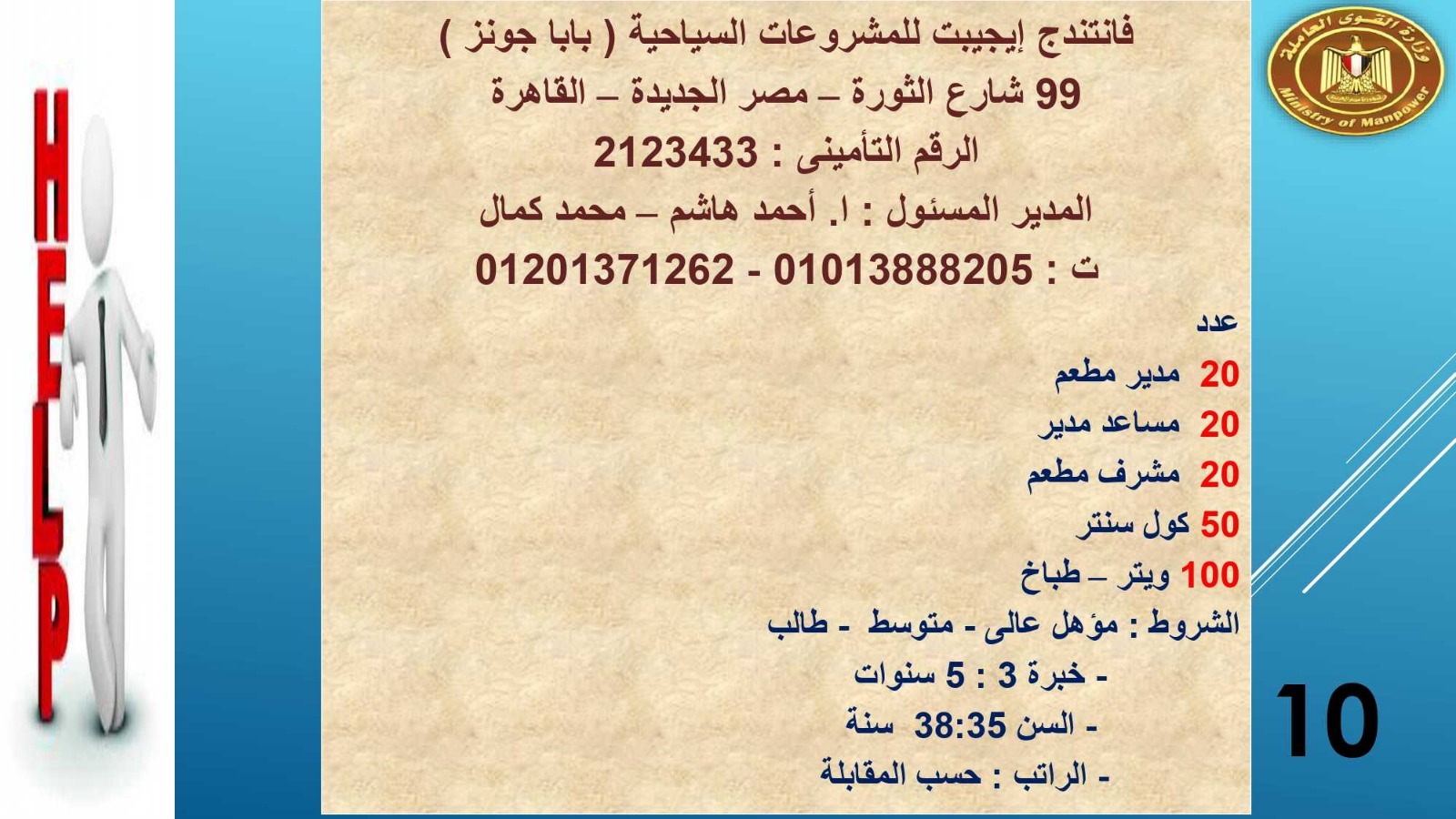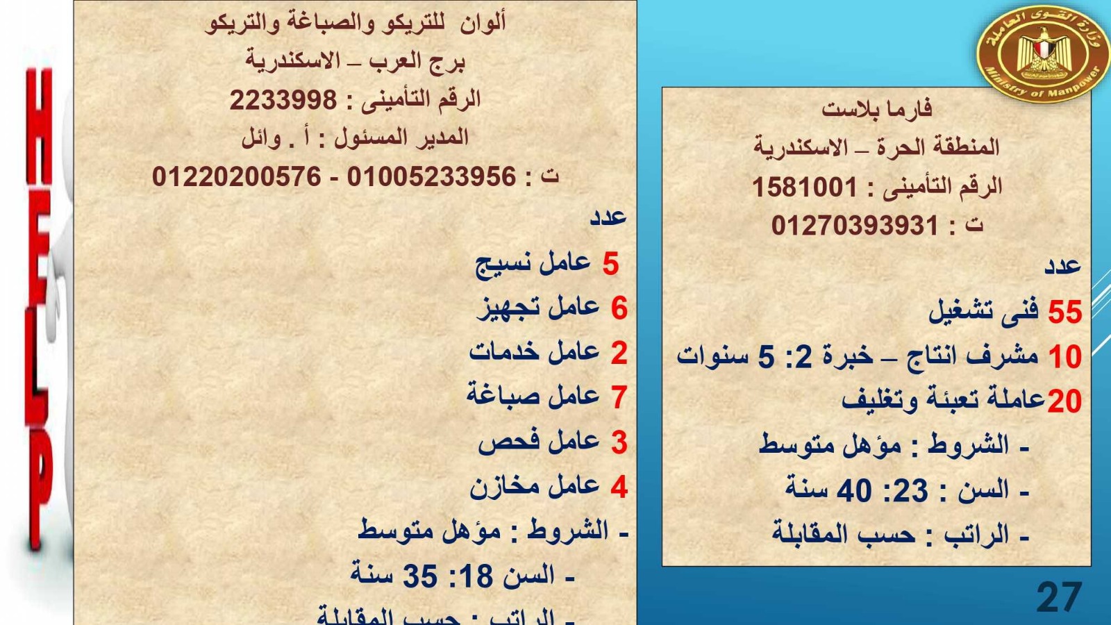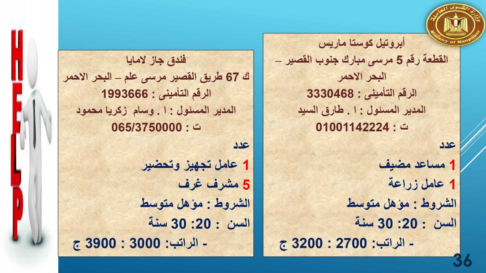 والدقهلية، والمنيا، والوادي الجديد، والبحر الأحمر في التخصصات الاتية: مهندسين ميكانيكا وإنتاج وكهرباء، ومحاسبين، ومندوبين مبيعات، ومشرفين جودة، وأخصائى سلامة وصحة مهنية، ومدير مطعم، ومساعد مدير، وعمال إنتاج، وصيدلى، وكيميائى، ومساعد صيدلى، وسكرتارية، وأفراد أمن بمواقع مميزة، وكول سنتر، ومسئولين إئتمان، ومدرسين، ومشرفين رياض أطفال، وكافة التخصصات الفندقية، ومهن التفصيل والخياطة، وفنيين، وسائقين، وعمال نظافة،وتخصصات أخرى.