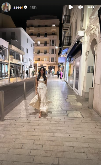 فيما شاركت أسيل بعض الصور وارتدت بها تنورة أوف وايت طويلة مع توب على شكل كورسيه باللون ذاته ونسقتها مع حذاء بني فاتح. ثم التقطت صورة أخرى لها من الفندق..