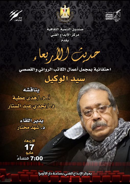 ينظم صالون حديث الأربعاء والذى يقيمه قطاع صندوق التنمية الثقافية، احتفالية لتكريم الكاتب الروائي والقصصي سيد الوكيل، وذلك فى السابعة من مساء اليوم الاربعاء الموافق 17 مايو الجاري بمركز الابداع الفنى بساحة دار الاوبرا المصرية.