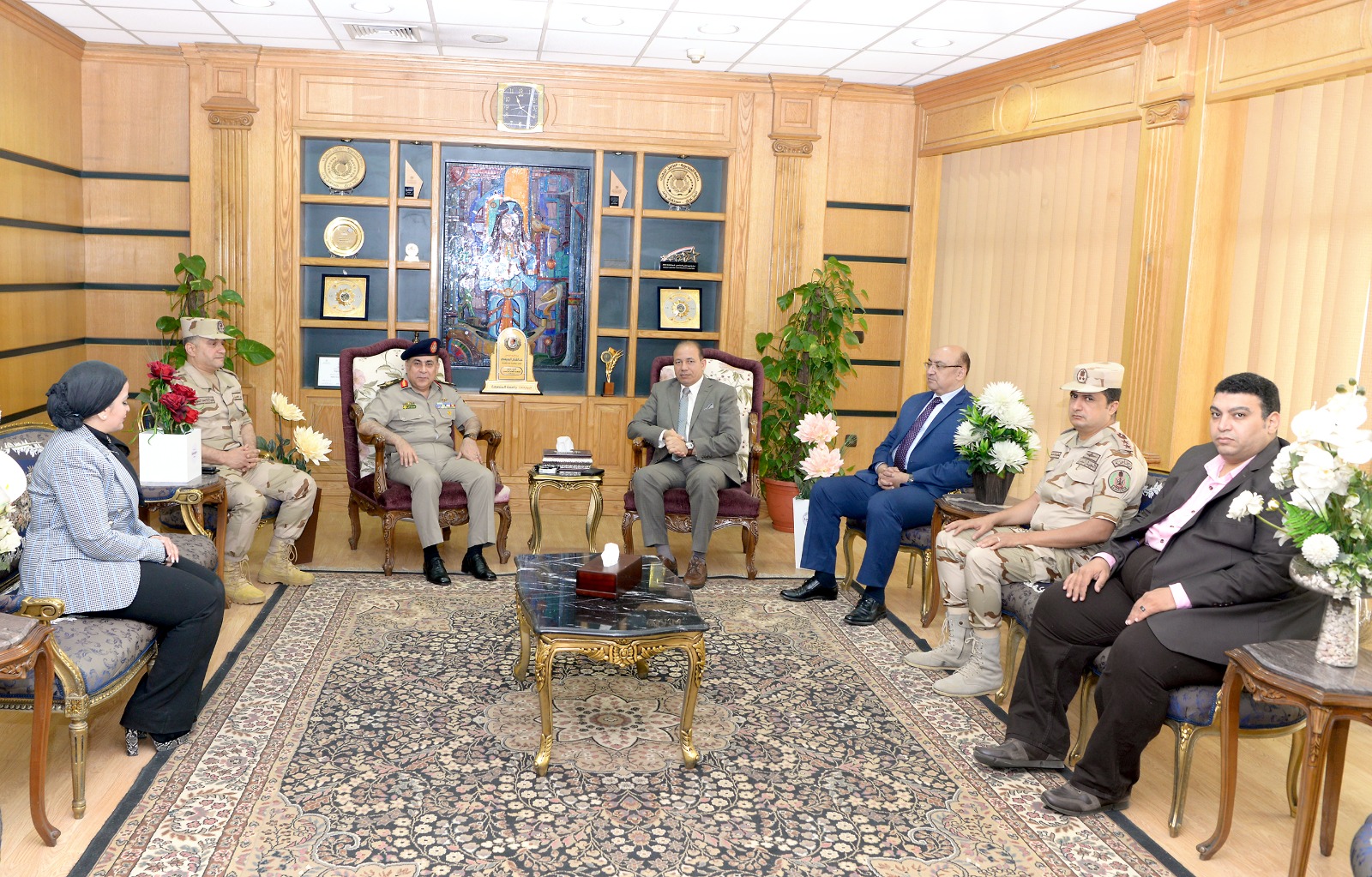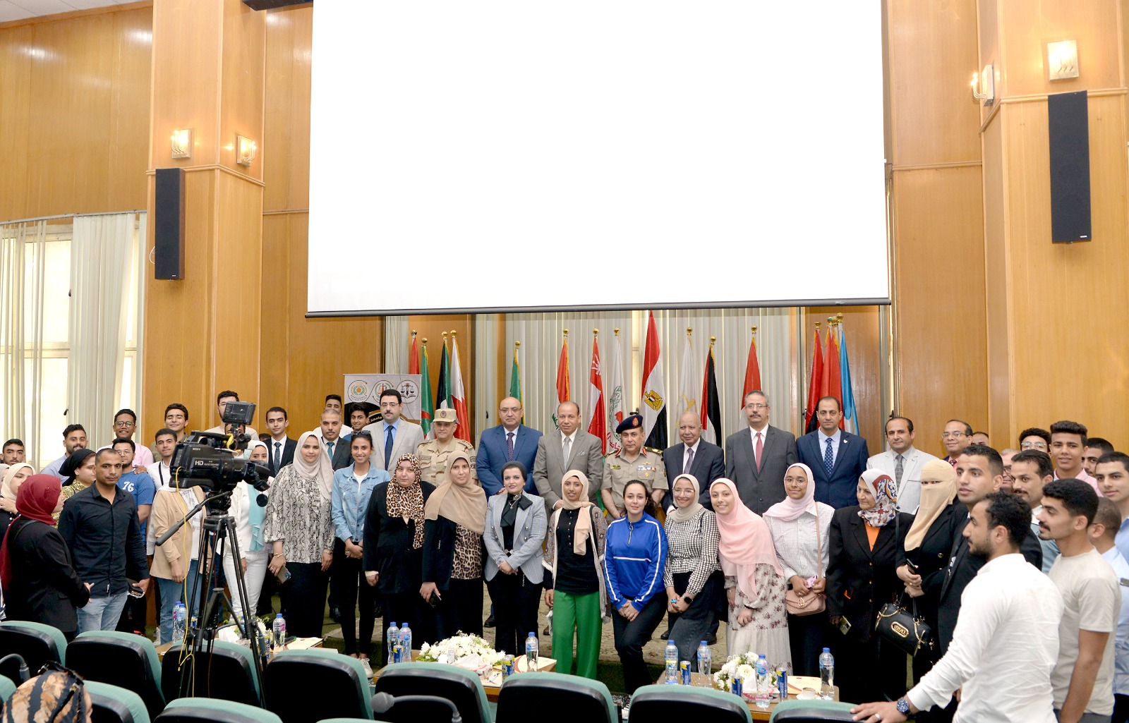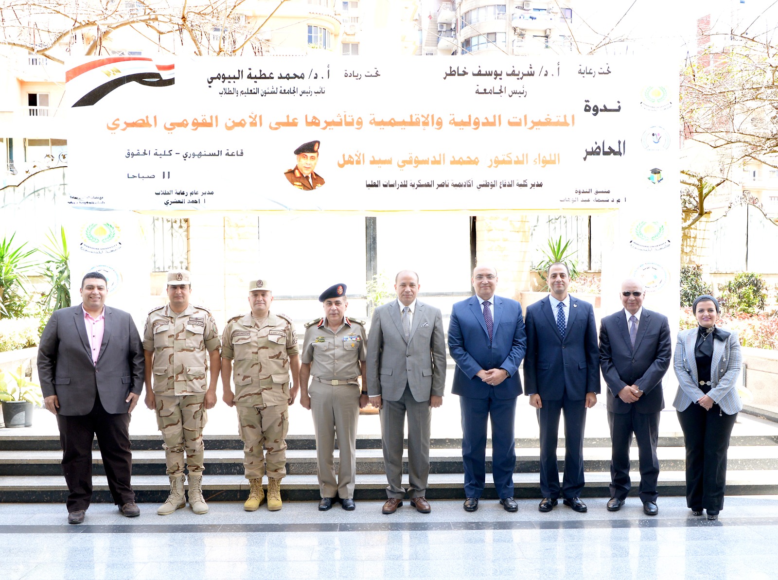 بحضور الدكتور محمد عطية البيومى نائب رئيس الجامعة للتعليم والطلاب، الدكتور محمد سويلم البسيونى نائب رئيس الجامعة الأسبق، العميد أحمد السويدى المستشار العسكرى، العميد وائل أبو الفتوح رئيس مكتب المخابرات الحربية بالدقهلية، الدكتور وليد الشناوى عميد كلية الحقوق، عمداء الكليات المختلفة والوكلاء، الدكتورة شيماء عبد الوهاب منسق الندوة، الدكتور محمد صبرى سرايا منسق الأنشطة الطلابية، أشرف علي التنظيم أحمد العشري مدير رعاية طلاب جامعة المنصورة .