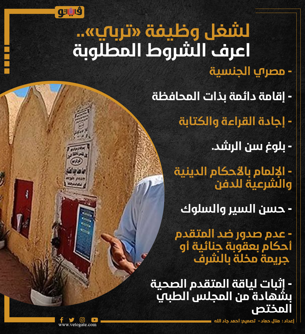 لشغل وظيفة «تربي».. اعرف الشروط المطلوبة (انفوجراف) الأربعاء 17/مايو/2023 - 12:14 م 5/17/2023 12:14:30 PM شروط شغل وظيفة تربي، فيتو منال حماد شارك طباعة 18 حجم الخط شارك طباعة الجيزة محافظة الجيزة المجلس الطبى القراءة والكتابة الصحي