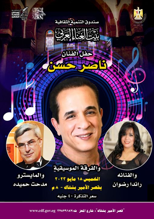 يقيم قصر الأمير بشتاك والتابع لقطاع صندوق التنمية الثقافية في تمام السابعة من مساء غد الخميس الموافق 18 مايو الجاري، حفل غنائى للفنان ناصر حسن وفرقته الموسيقية.