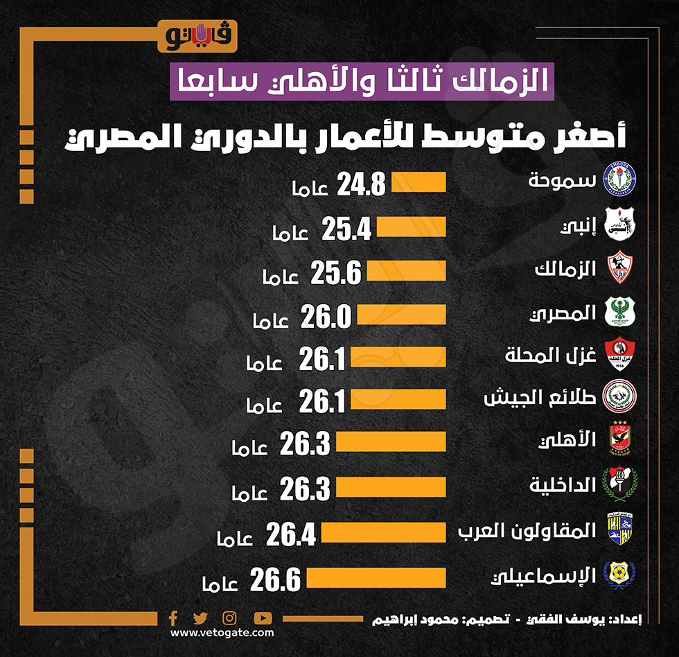 الزمالك ثالثا والأهلي سابعا، أصغر متوسط للأعمار بالدوري المصري (إنفوجراف)