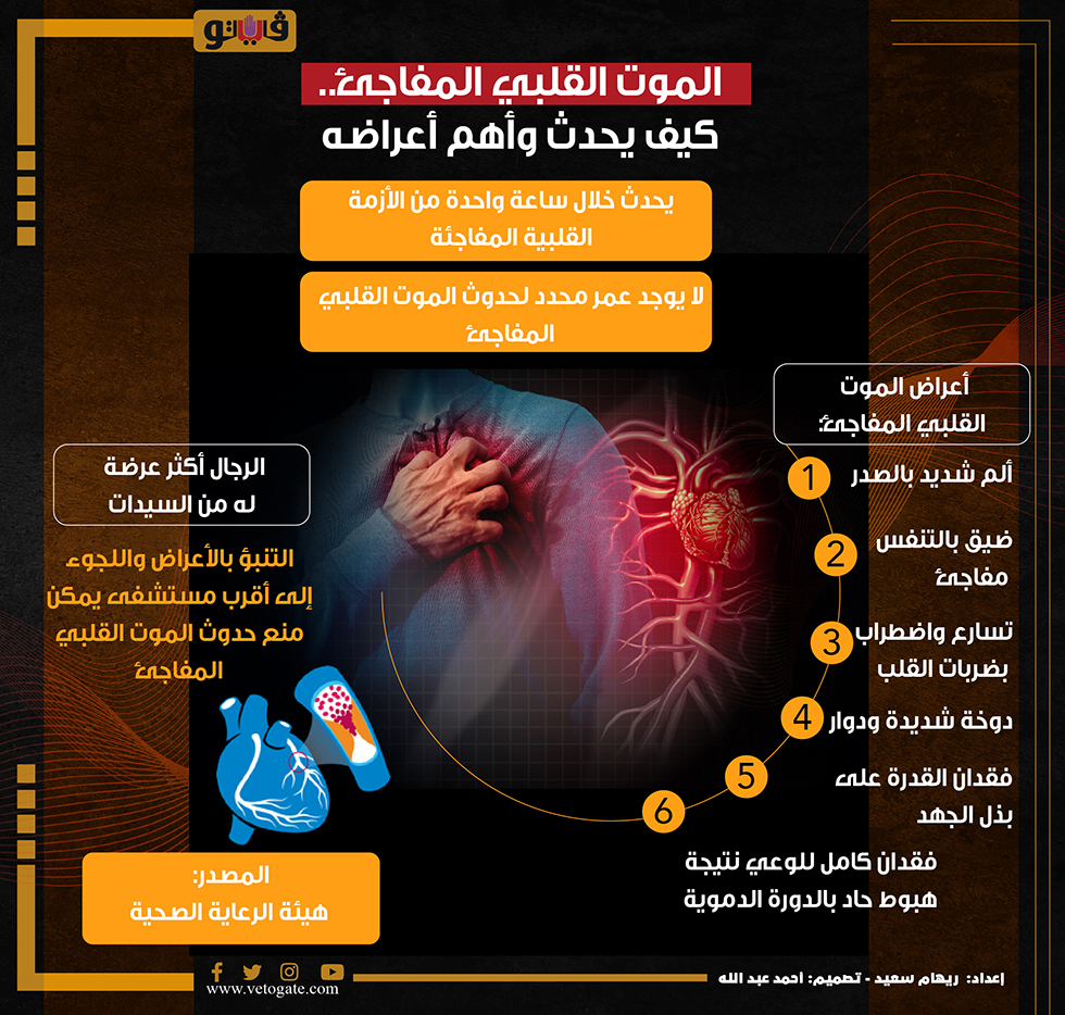الموت القلبي المفاجئ.. كيف يحدث وأهم أعراضه (إنفوجراف) الأربعاء 17/مايو/2023 - 08:33 م 5/17/2023 8:33:15 PM الأزمة القلبية،فيتو ريهام سعيد شارك طباعة 18 حجم الخط شارك طباعة الأزمة القلبية المفاجئة الأزمة القلبية الرعاية الصحية هيئة الرعاية الصحية